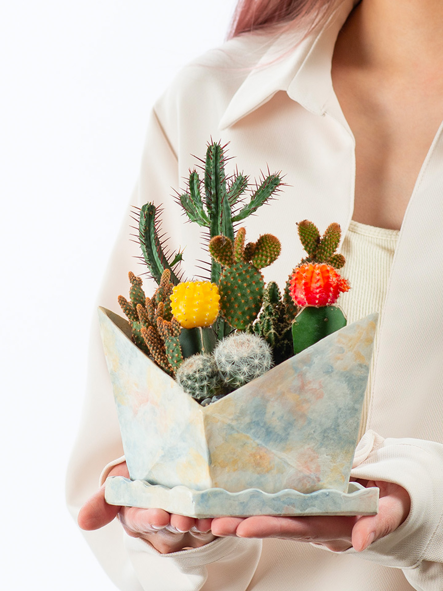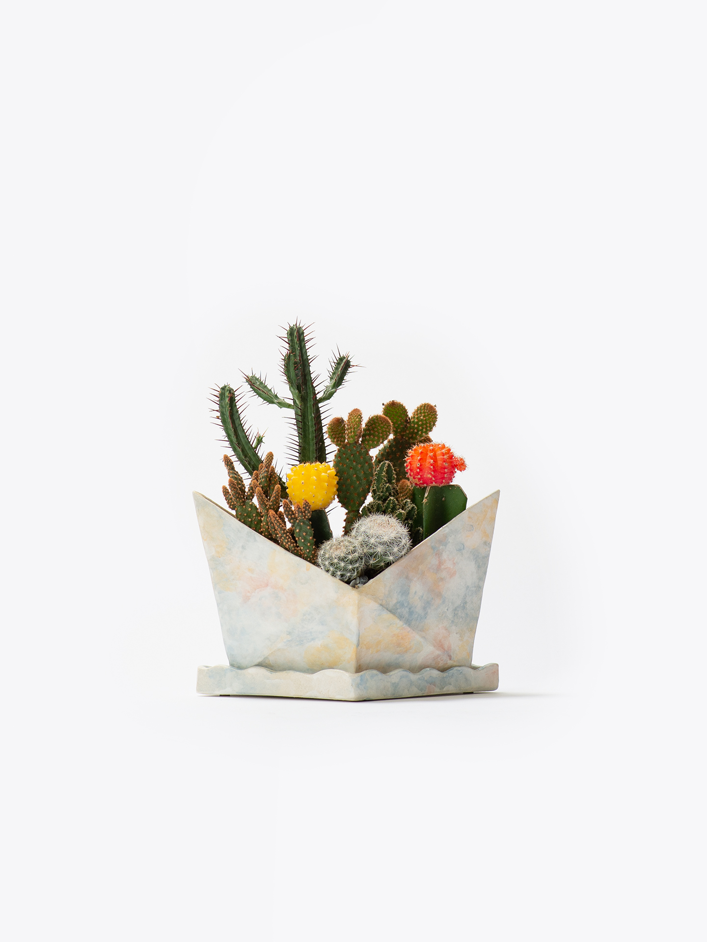 偶們,是關於描繪愛與日常的陶瓷品牌,帶著一點幽默,帶著一點優雅。擷取土地的溫度,在陶器上刻畫人與人之間的各種關係,參雜些許生活的趣味與笑料,在值得紀念的時刻裡,偶們能一起參與你們最珍貴的回憶,傳遞愉悅與溫暖。滿載而歸系列:以童年摺紙船為設計,在盆器上刻畫摺紙的紋路,並在口緣削出薄如紙般的邊緣。如油畫般的色彩搭配豐富多樣的植栽,象徵著滿載的祝福和希望航向幸福。